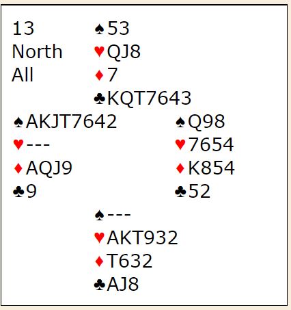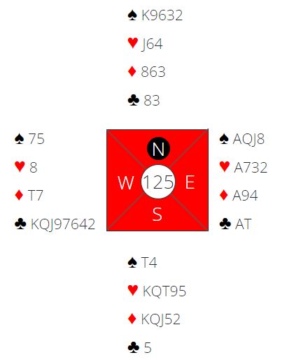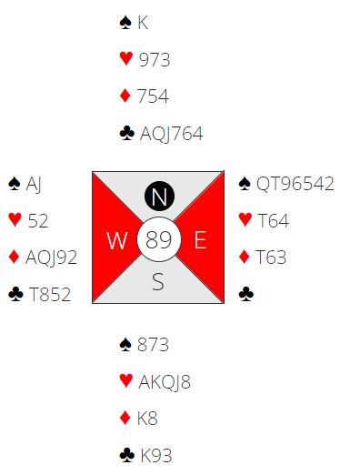 Fordelingskort så det holder, og da blir det ofte sving. N/S har kun en taper i kløverkontrakt, men Ø/V kan få to motspillstikk hvis N/S får spille med kløver som trumf. Da må de få med seg ruterstikket og ett trumfstikk (!) med hjerterspill fra øst som vest kan trumfe med sin single trumfnier. Det motspillet finnes neppe i praksis, så N/S vinner normalt tolv, eller tretten stikk (hvis de ikke får med seg ruterstiket sitt) i kløverkontrakt. Om de får spille det da...for hva med Ø/V i sparkontrakt?