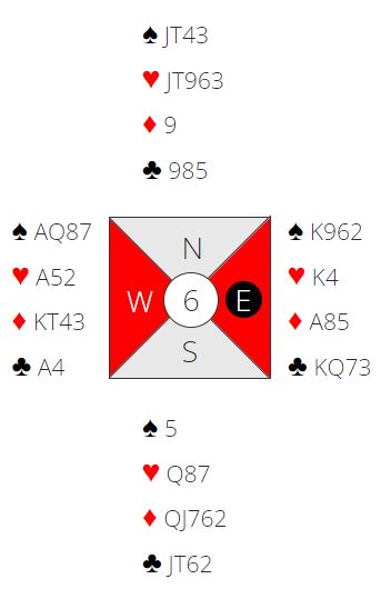 Det er en bedre kontrakt siden det er ett ekstra stikk ved hjelp av en hjerterstjeling hos øst (ekstra trumfstikk). 6 spar kan vinnes for egen maskin uansett utspill, syd kan skvises om det spilles godt. Men hele elleve par vant 6 spar enkelt etter ruter dame i utspill fra syd. Så å stoppe i utgang ga under middels. Kun fire par gikk bet i 6 spar, alle etter at syd unngikk å spille ut ruter dame.