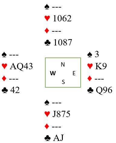Også mot 3 hjerter spilte syd ut spar. Men der hadde spillefører ingen informasjon om trumfsitsen og spilte hjerter ess i første trumfrunde! Dermed måtte det bli bet i 3 hjerter i et spill hvor resultatet var 4 hjerter redoblet med ti stikk ved det andre bordet!