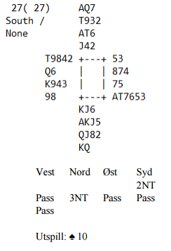 Nord bør ikke melde Stayman med 3-4-3-3 fordeling og verdier både her og der. Noen kan være fristet til å sleminvitere (for eks. med kvantitativ 4 NT), men med 11 hp og helt jevn fordeling er det ikke nok (maksimalt 32 balanserte til sammen). Utspillet vinnes av syd. Hjerter ess tas først, så spilles ruter til tieren (ikke damen, for vest kunne ha hatt ruter konge singel og da er liten mot nord første gangen løsningen. Det gir om vest faktisk har kongen singel fire ruterstikk mot kun tre hvis damen eller knekten spilles først, dekket av singel konge. Og en ruterfinesse til kan jo tas senere hvis liten til tieren står som her. Hjerterfinessen tas (syd er ikke synsk). Senere får Ø/V kun for kløver ess, og det blir elleve stikk. Det blir de samme stikkene i hjerterkontrakt hvis ikke hjerter dame toppes ut. Med denne hjerterfargen isolert sett er beste sjanse å ta finessen heller enn å toppe. Finesse blir riktig med damen tredje, fjerde eller femte foran. Å toppe er kun riktig om damen sitter dobbel bak, en betydelig mindre sjanse. Merk dog at hjerter ess bør tas først, det er helt unødvendig å gi bort stikk til en eventuell dame singel hos vest. N/S: +460 //