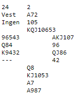 Det er vel ganske naturlig å havne i slem (?), i alle fall om vest åpner med 1 grand. Hvis vest velger å åpne med 1 kløver har han et lite gjenmeldingsproblem, 1 spar eller 2 spar (litt for svak slik de fleste spiller), eventuelt oppvurdere til 18-19 grand. Derfor er jeg tilhenger av grandåpning med en god del sånne 2452 hender så er i alle fall styrken sagt fra om. Vikersund brant slemmen! I 3 grand ble det tretten stikk, 12 IMP til «the good guys».