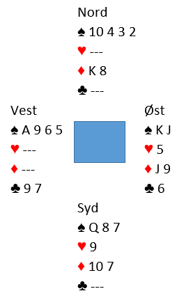 Nå spilte syd trumf, og vest ble innspilt på det singel trumfesset og måtte gi kløver til saks eller hjerter til dobbeltrenons.