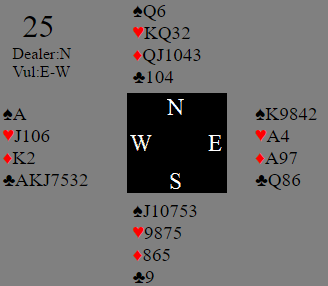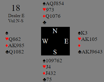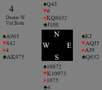 Det er ikke så lett å finne frem til storeslem med disse kortene selv om syd åpner med en sterk 1NT, spesielt fordi øst mange steder kom seg med i meldingene i de for Ø/V gunstige soneforholdene. De som tidde stille med østs kort angret nok på det da N/S fikk tid og anledning til å kommunisere, og noen (ca. 25%) meldte da storeslem i spar eller grand som begge var nedlegg. Der øst var med og forstyrret ble det vanskelig. Men selv om for eksempel nord får spurt med Key-Card Blackwood kan han ikke se tretten stikk sånn uten videre. Det er syds fjerde hjerter (at han har fire kort der han har A-K, og nord Q-J) som gjør det så perfekt, tretten enkle stikk. Hvis syd har en annen 4-3-3-3 fordeling er det ikke nødvendigvis mer enn tolv.