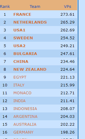Monaco med Helness-Helgemo på laget fikk altså litt pluss mot oss, og før det tapte de knepent mot India, men en storseier mot Guadeloupe i morgenkampen gjør at de er bare 4VP bak 8.plassen.