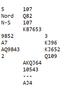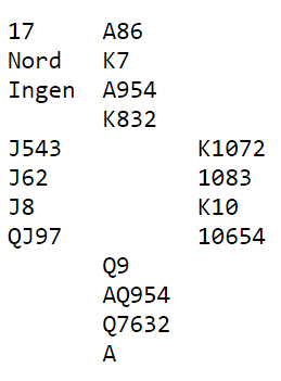 Det er imidlertid ikke lett å finne frem til slem. Jeg synes ikke nords 14 poenger er nok til å oppvurdere hånden til 15-17 grand, men noen gjorde det. Da er det ganske bra sjanse for at det blir slem til slutt, etter at syd hadde overført til hjerter og så vist ruterfargen som blir støttet.