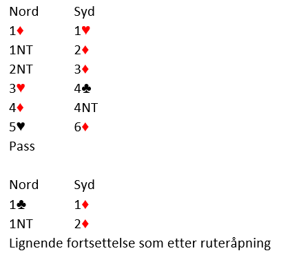 Hvis nord åpner med 1 i minor er det verre. Da viser han i andre melderunde 12-14 grand, og syd må i så fall være ganske optimistisk for å satse på slem. Lettest finnes vel slemmen for de om åpner med 1 ruter med 4-4 i minor, da vet i alle fall syd om en fin 5-4 tilpasning.