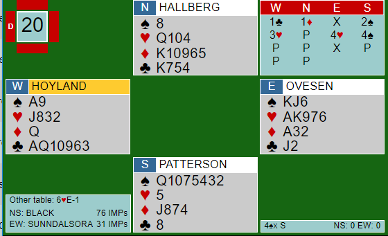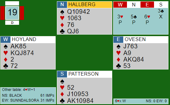 Etter Pattersons sperremelding i kløver sperret Hallberg så høyt han kunne, og Ovesen fikk et vanskelig valg. Da det var sannsynlig at Høyland hadde singel (eller renons) i kløver, og han har meldt inn på tre-trinnet i faresonen (ugunstig), mente øst det var god sjanse for slem. Det var det ikke, og da syd doblet ble det en score av den nitriste typen.