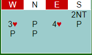 Men han fikk det som han ville. Da spar konge vant første stikk skiftet han til hjerter, og N/S tok seks hjerterstikk samt også spar ess for fire doblede bet, +1100 til N/S.
