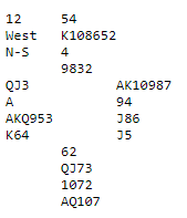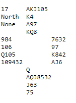 Denne meldeprøven var nok litt lettere. Igjen har makkerparet tretten stikk i spar, hjerter og ruter, men motparten har ett ess. Ved mange bord viste nord 20-21 grand, og syd blåste da ut i 6 hjerter, som regel etter å ha overført til hjerter. Igjen kunne det vært veldig viktig å ha kontrakten på den sterkeste hånden, for eksempel om nord hadde hatt kløver konge tynt tredje i stedet for KQ. På dette spillet ble det meldt og vunnet slem ved omtrent 80% av bordene. Ved to bord ble det meldt storeslem, og det ene paret som gjorde det fikk en noe ufortjent rom-topp da de vant den! På spillstensilen står det at kontrakten ble spilt av nord, og at øst ikke tok for kløver ess i utspill. Kanskje hadde meldingene gått sånn at utspilleren trodde syd var renons i kløver, men uansett måtte det ha vært en nitrist opplevelse for Ø/V. De få som var kun i utgang med disse kortene må ha stoppet etter at nord valgte å åpne som 1 spar, tipper jeg.