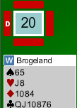 Slik det var med kløver konge i avkast tidlig (vest holdt altså igjen 10-9 dobbel i kløver) fikk nordmannen til en søt sluttposisjon. Han tok de gjenværende sparstikkene før han spilte kløver mot hånden. Øst måtte legge liten, og det gjorde syd også! Vest var tvunget til å vinne stikket, og inne på kløver 9 satt han igjen med hjerterne sine og kløver 10. Han måtte fortsette med kløver 10, men da kunne Brogeland dekke og måtte få kløverstikk for enten knekten eller åtteren!