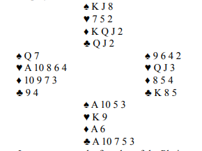 Her har Ø/V tretten bombesikre stikk (men motparten har ett ess) i fargene spar, hjerter og ruter, og vest har kløver konge. Så 6 grand og 6 ruter spilt av vest er ideelle kontrakter, da er kløver konge beskyttet. Også 6 spar spilt av vest er like bra. Beste kontrakt er 6 grand hvor det ikke finnes noen fare i det hele tatt, mens i trumfkontrakt kan N/S noen ganger få seg en stjeling. Slik det satt var det ingen problemer i noen av de mulig slemmene, selv om slem ble spilt av øst gikk det bra siden kløveren satt gunstig.