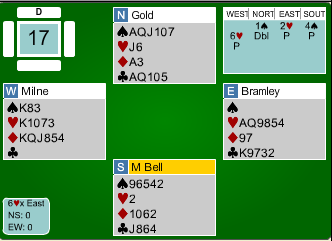 Nord (David Gold, England) kan vel neppe klandres for å doble slemmen med tre ess (!), men Bramley hadde ingen problemer med å vinne tolv stikk, forsvaret fikk kun for ruter ess.