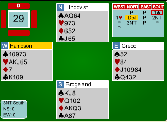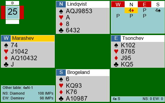Brogeland passet, men da nord åpnet med 1 ruter og syd sa 1 hjerter etter pass fra øst gikk han innpå med 2 kløver! Nord sa 2 ruter og Lindqvist løftet til 3 kløver som Brogland fikk spille. Den kontrakten gikk tre sonebeter, men det var et godt spill da N/S hadde mistet sin 4-4 tilpasning i spar, og de kunne vunnet utgang. Ved det andre bordet vant N/S +620, 8 IMP til DIAMOND.