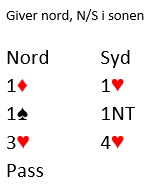 4 hjerter har mye bedre sjanser, og syd bør ser det, i alle fall etter disse meldingene. Nords 3 hjerter i tredje melderunde er veldig beskrivende, han må ha akkurat noe sånt som dette.