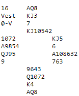 Hvis en skal tro det som ligger i BBO fila (det hender operatørene feiler) så ble slemmen vunnet etter et svakt motspill. Det ser som sagt ut som om det er bet i slemmen slik det sitter med en taper i trumf og en i spar. 6 ruter kan dog vinnes om sitsen leses korrekt. Spillefører må plassere nord med all sparen og kløver konge.