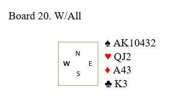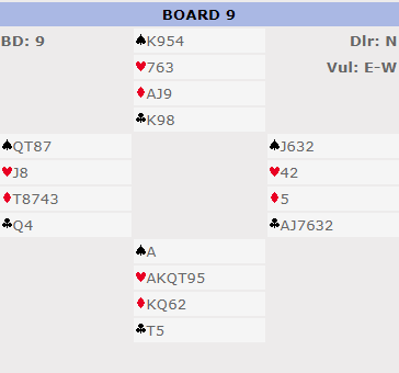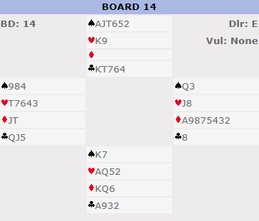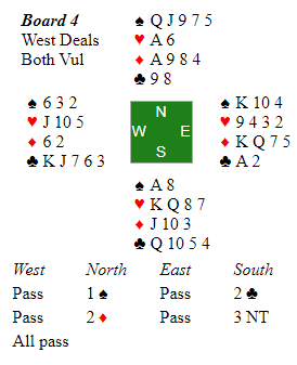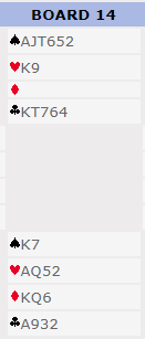 Kun 10% av N/S parene meldte 7 spar. Den er ikke helt nedlegg siden trumfen sitter 4-1, men det går greit etter to trumfrunder å ta to store kløver og stjele en kløver. Selv om den fargen ikke hadde blitt godspilt som her ville det vært tretten stikk med fem sparstikk (en stjeling og fire trumstikk på den andre siden), fem hjerterstikk, ruter ess og ess-konge i kløver. Siden kløverstjelingen må tas før trumfen tas ut (siden sparfargen satt 4-1) kan ikke kløverfargen sitte verre enn 4-2 for at det skal gå bra.