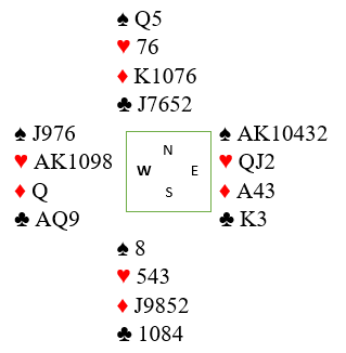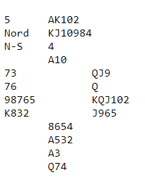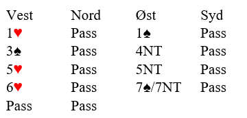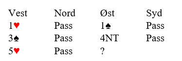 Det spørs litt med hensyn til avtaler om vest kan bruke Stayman 4 kløver over et eventuelt hopp til 3 grand. Det er klart at hjerterkontrakt KAN være bedre enn grand, men vests hjerter er veldig tynn, og eventuell hjerterkontrakt kan noen ganger være sårbar hvis trumfen sitter skjevt. Det er vel ikke helt galt å bare hoppe til 6 grand heller.