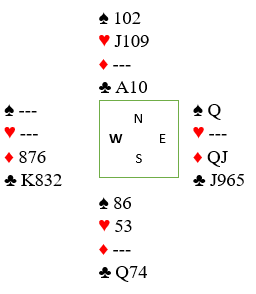 Det utgjør forskjellen mellom en bet og vunnet utgang hvis spillefører tenker på denne mulig rutersitsen og tar en ruterfinesse med det samme idet han er inne på hjerter ess i tredje stikk. Det bør spilles ruter til tieren akkurat da, så tre runder trumf, og den tredje runden tas med bordets konge. Spillefører er nå også inne på bordet for siste gang, men etter dette ser ruterkombinasjonen slik ut: