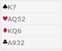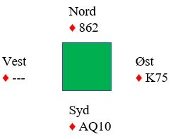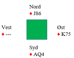 La oss si spillefører "glemmer" det at det kan sitte akkurat slik som det faktisk gjorde og starter med å ta ut trumfen i tre runder, den siste med bordets konge. Så ruter knekt. Den får løpe rundt, men da blir situasjonen i ruter denne: