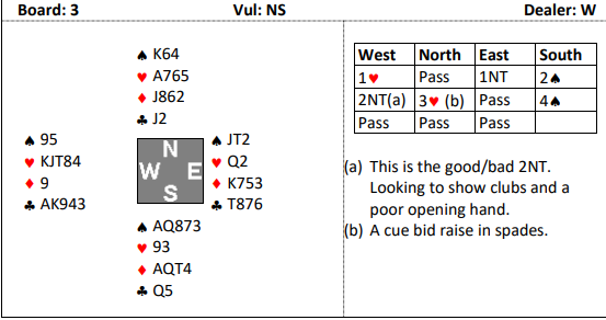 Øst kan kanskje kontrollmelde nå, men det er helt utenkelig at åpneren kan ha fem små hjerter, så et direkte hopp til 4NT over 3 spar er fornuftig nok. Det er Key-Card Blackwood, og vest viser to nøkkelkort med spar som trumf (dvs. vest har hjerter ess og kløver ess).