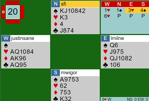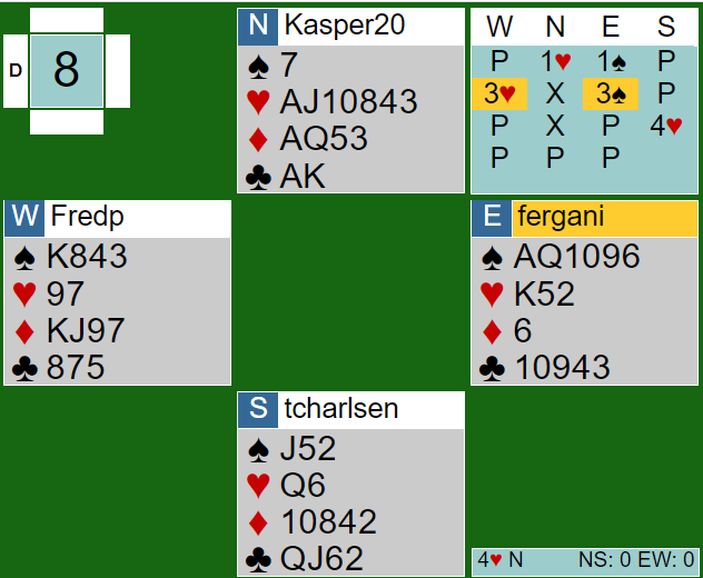 Over nords 1 spar var østs 3 hjerter sperremelding med minst fire trumf (typisk 3-6 poeng). Det var nok for vest som over syds 4 spar avsluttet meldingene med en praktisk 6 hjertermelding. Den stod, 15 IMP til lag KIWIS.