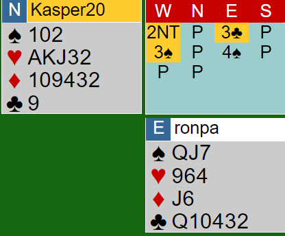 Ved vårt bord åpnet vest med sterk, kunstig 1 kløver, og jeg (nord) hoppet inn med 2 spar. Øst doblet (6+ poeng), og min makker (syd) sa 4 spar. Nå var Ø/V kommet i den ekle situasjonen som skjer ganske ofte etter sterk 1 kløver, de vet de har en del poeng til sammen, men de har ikke fått vist noen av fargene sine.