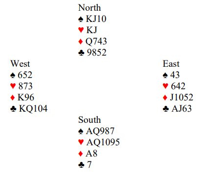 N/S kan vinne 3 grand siden Ø/V ikke kan ikke få fatt i mer enn fire majorstikk. N/S har også 5 ruter i kortene, der tapes til de to majoressene. Det er imidlertid kun ti toppstikk i ruterkontrakt hvis trumfen tas ut i tre runder, ni minorstikk og ett ekstra trumfstikk med en stjeling på syds hånd. Det er flere muligheter til å kunne vinne det ellevte, og en variant etter at øst har fått for spar ess er å presse ut østs spar dame mot trumf slik at spar 10 eller knekt gir stikk.