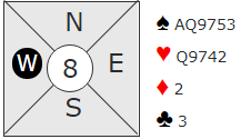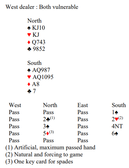 Selv om vests pass er definert/avtalt som krav, er det spørsmål om det er beste melding med vests kort i denne situasjonen. Vest vil i slem. Å si 5 hjerter kan bli feil, makkeren kan godt passe med dobbel hjerter. Da kan de kanskje ha misset en fin lilleslem i en minorfarge. En mulighet er 5 grand: «velg en slem». Da ender de i 6 ruter i dette tilfellet, og det er en fin slem.