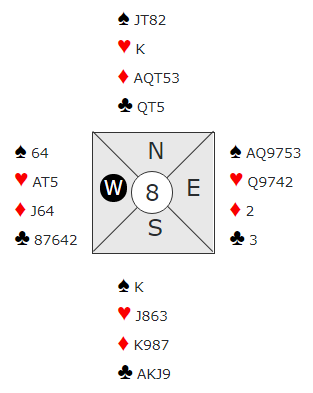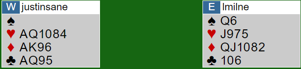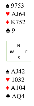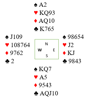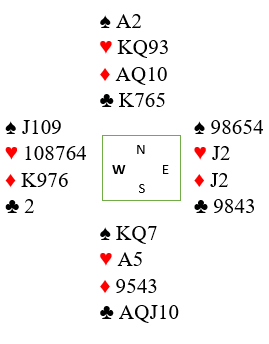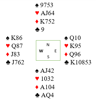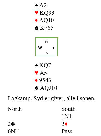 Ved det andre bordet spilte vest 3NT. Nord spilte ut stor hjerter. Nå er det to bet om nord skifter til ruter. Syd vinner med esset, og hjerter gjennom gjør at forsvaret får fem hjerterstikk pluss ruter ess. Nord fant imidlertid ikke det motspillet. Han dengte ned den andre store hjerteren i håp om damen dobbel hos vest, men da stod 3NT!