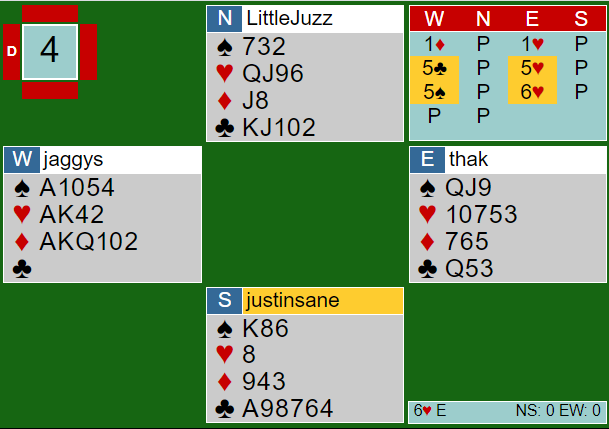 Hoppet til 5 kløver var Exclusion Blackwood (spør om nøkkelkort utenom kløver). Jeg tipper øst angret seg for svaret sitt nå. Jaggy pushet på til 6 hjerter. Det er ingen hårreisende slem, men for hardmeldt. Hjerteren må sitte 3-2, og selv om det ser ut som ingen tapere utenom hjerter må nok sparfinessen gå også. Her, med den trumfsitsen var det sjanseløst, og våre lagkamerater noterte +100 for en bet, og vi vant 7 IMP!