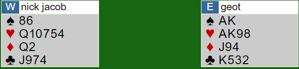 Helt mot slutten av kampen tenkte kanskje Nick at han ikke skulle ha noe av at det gikk pass rundt på ett-trinnet igjen og åpnet med 2 kløver med sekskortsfargen og (19)20 poeng. Det er antagelig oftere feil enn riktig. Og det var feil da jeg hadde singel hjerter og bare en knekt! Det var spill for 5 kløve (øst hadde fem kløver), men vi havnet i det som oftere har sjanse, en nokså dårlig 4 hjerter.