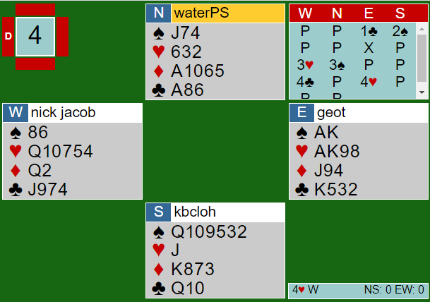 Vest (Nick) var i 4 hjerter etter at syd hadde hoppet inn med en svak 2 spar over min 1 kløver, og N/S hadde vært med til 3 spar.