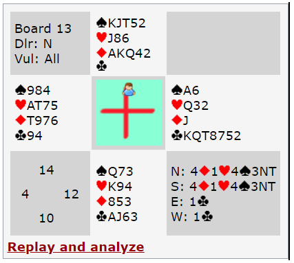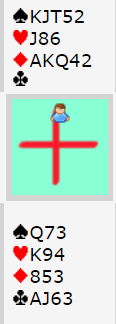 Det kan ikke tapes mer enn ett stikk i spar, ett stikk til trumfesset og ett i ruter. Det kan være muligheter for å godspille kløveren, og i så fall kan det bli hele tolv stikk. Men det er litt farlig å gå i gang med kløverspill tidlig siden kløveren kan sitte 5-1.