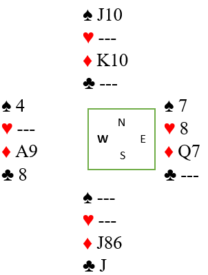 Spillefører vet hele fordelingen idet han fikk vite kløversitsen og han vet jo spar- og trumfsitsen. Ikke nok med det, han vet også med sikkerhet hvem som har ruter konge siden nord åpnet. Nord vil bli utsatt for et kraftig press siden han må holde ruter konge dobbel og er alene om å holde sparfargen. Spillefører tar alle trumfene. Før den siste trumfen ser det slik ut: