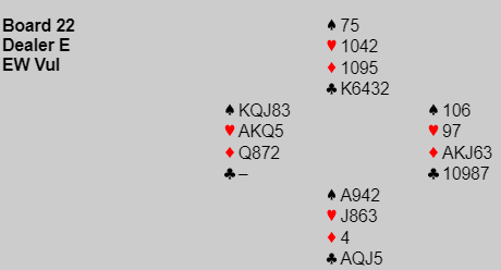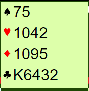Han vant med hjerter ess, spilte spar til kongen, spar til damen fulgt av ruter ess, ruter konge og ruter til stjeing. Så spilte han seg hjem på kløver ess og tok alle trumfene. Siden nord har veldig lang hjerterfarge var det ikke noen stor overraskelse at syd var alene om både ruter og kløverholdet. Før den siste trumfen så det slik ut: