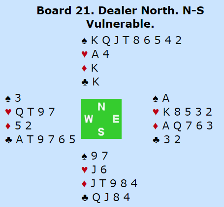 Hjerter 10 ga avkast for en spar, og den femte hjerteren kunne så godspilles og gi avkast for en spar til. Dermed var det tolv stikk, +920 til lag HANS. Det ga 10 IMP inn siden Nickells N/S-par spilte 3NT med ett overstikk.