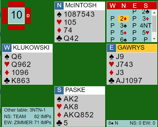 Zimmmermann-Piedra var i 6 hjerter. Som du ser kan den lett betes med kløver ess og mer kløver til stjeling. Det motspillet er imidlertid med åpne kort og ble ikke funnet. Uansett er 6 hjerter en hårreseinde slem. Hjerterfargen må ordne seg uten taper, og i tillegg må ruter dame sitter hos nord! Og alt det etter å ha unngått kløverstjelingen. Men slemmen føk hjem, og +980 ga 11 av de 15 IMP'ene ZIMMERMANN fikk i kampen.