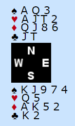 Om ikke hjerter var meldt av vest kunne hjerterutspill vært et alternativ. Siden du vet det er femkorts farge i hjerter (noen få steder kun minst fire hjerter) må det velges mellom et offensivt utspill i en minorfarge, eller trumfutspill. Selv hater jeg trumfutspill med singelton. Dermed er kanskje kløverutspill det beste? Det er uansett et skudd i mørket, alt kan blir feil, alt kan bli riktig.