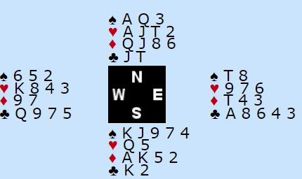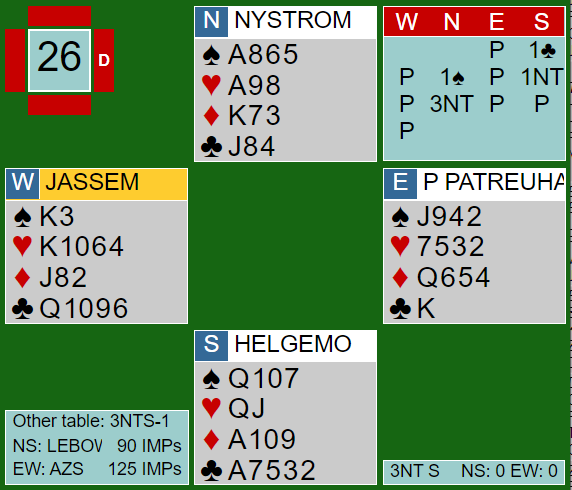 Ved det andre bordet åpnet øst med 3 hjerter. Da fikk N/S melde litt mer kontrollert og syd meldte inn 3 spar før Bertheu (nord) avsluttet med 3NT. Det er ganske normal kontrakt med 25 HP til sammen, kun en 5-2 tilpasning i en major, og dessuten to stoppere i motpartens farge. Men her var det ikke tingen.