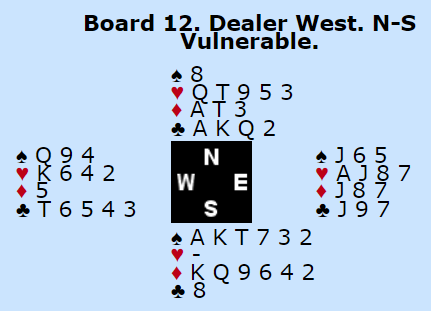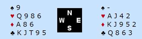 Dette utgangen burde vel være ganske enkelt å vinne på flere måter for mange, og ikke det aller mest spektakulære vi har sett fra den kanten, men det skjedde annerledes enn spillet gikk ved de fleste bordene. Og nesten halvparten av N/S-parene gikk bet, noen av dem bet i 3 hjerter (!), og enkelte gikk to bet i 4 hjerter (for eks. de bommet trumfen med esset først, og bommet også kløveren).