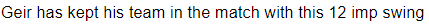 I mange kamper ble utslaget 10 IMP med utgang vunnet ved ett bord, en bet ved det andre. I ECF HOLDING sin kamp ble det 5 IMP inn for det norske laget da Ovesen-Thoresen stoppet i 2 spar og fikk ni stikk