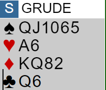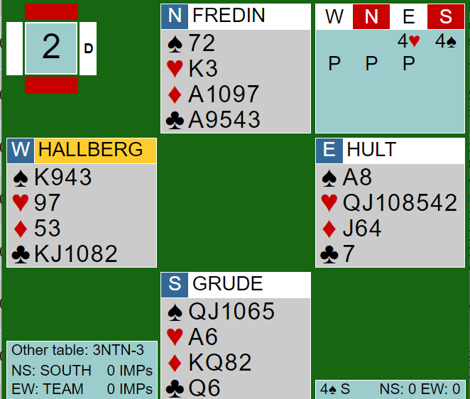 Tor Evind Grude ble satt press på både i meldingene og spilleføringen i dette spillet fra en kamp hvor Grude og Fredin møtte svenske kamerater, Hallberg-Hult. Ved det andre bordet satt også en velkjent svenske på Fredins plass (nord). Grude satt syd med øst som giver og N/S i sonen.