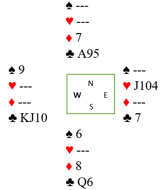 Sålenge vests 3 kløver-melding må innebære minst fem kløver (åpningen kan jo være med tre kløver) må østs fordeling være en av disse, 4S 4H 2R 3K, 3-4-3-3, eller 4-3-3-3. Følgelig har vest maks en hjerter. Dermed er det helt trygt å spille hjerter knekt for å unngå mer enn en trumftaper, samme hvor trumfhonnørene befinner seg!