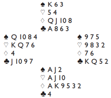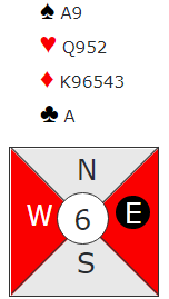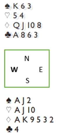 Her kan N/S vinne 5 hjerter eller 5 spar, Ø/V kan vinne 5 ruter. Det skal imidlertid svært lite endring av sitsen til før Ø/V vinner slem.