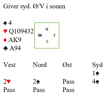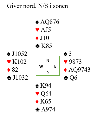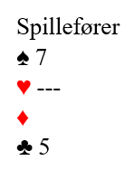 Han måtte kaste kløver knekt eller hjerter konge. Hvis man ikke har fulgt med og ikke har tellinga er det ofte slik at det visuelle avgjør. Han ser altså hjerter dame på bordet og glemmer resten. Så han holder på hjerterkongen og kaster kløver knekt. Men idet den femte sparen ble spilt satt altså nord med: