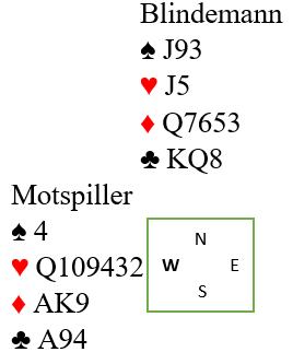 Du stikker utspillet med kløver ess og spiller kløver til trumf med det samme. Trumf gjerne høyt, du har jo på en måte like store rutere hos blindemann. Så trumf til nord og nok en kløverstjeling, gjerne høyt igjen. Begge motspillerne følger farge i første ruterrunde. Så følger en andre runde trumf til bordet, og nords siste kløver trumfes. Dette er igjen: