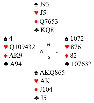 Det eneste N/S må gjøre i hjerterkontrakt for å vinne alle stikkene er å legge ned riktig trumfhonnør først, så fiske opp østs hjerter dame. Det hjertervalget var enkelt for de fleste da meldingen gikk slik at det var sannsynlig at vest hadde fordelingshånd og derfor trolig var han som var renons i hjerter hvis en av dem var det. For å vinne ti stikk i sparkontrakt som Ø/V må de kun finne kløveren (gjette hvor knekten er), men det bør gå bra da syd underveis må ha vist voldsom fordelingshånd og derfor trolig må ha kortfarge i kløver.