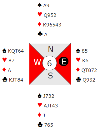 Da min ufullstendige analyse var postet i bloggen tok det ikke lang tid før et par medlemmer av "Klagenemda" hørte fra seg. For som spilleprøve i 6 spar UTEN kløver ess i utspill er det viktig å få med seg en tilleggsjanse før det gjettes i kløver, dog en veldig liten sjanse. Det er i utgangspunktet ett avkast i hver rød farge, men på hver side så det fortsatt blir igjen 3-3 i kløver. Ruterkombinasjonen gir imidlertid en bitte liten tilleggsjanse. Selv om Ø/V har kun fire ruter til sammen kan jo en sjelden gang damen sitte dobbel. Og som du ser, det gjorde den! Dermed blir det to avkast hos vest på østs ruter og noe kløvervalg er ikke nødvendig.