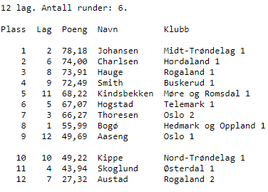 Gullkampen ble ikke avjort før i siste kamp. Midt-Trøndelag 1 (Johansen) ledet etter flere runder, men Hordaland 1 var litt foran før siste kamp. Da vant Midt-Trøndelag sin kamp med 15,61 - 4,31 VP og satte press på Hordaland 1, men de spurtet godt hjem til gull med nesten maksimum i sin kamp. Dermed var det 5,7 VP margin mellom nr. 1 og 2.