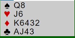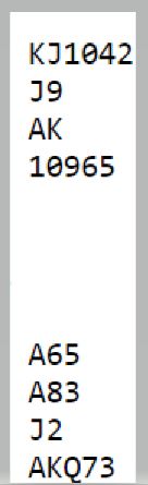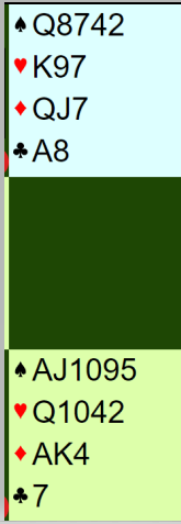 Men denne varianten hadde de ikke avtalt. Så syds 2 ruter var utgangskrav (XY), og 3 ruter var naturlig melding og viste 2-2-4-5, eller noen ganger 1-3-4-5 hvis hånden innebar et gjenmeldingsproblem som det absolutt var denne gangen. Da nord sa 3NT over syds 3 spar som viste minst sekskorts farge var det ikke lett å vite hva som er riktig med syds kort. Det kan stå slem, men det kan også være to hjertertapere fra start.